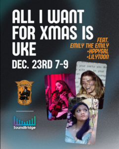 A very special holiday presentation of Lyrics Unleashed with Lilytoon, HppyGrl, and Emily Antonacci (of Emily The Band): All I Want For Xmas Is Uke! Join us 7pm to 9pm at Hound’s Rest for a cozy night of delightful ukelele tunes!